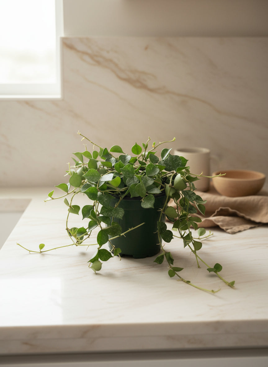 The Hoya curtisii is a charming trailing plant with tiny, heart-shaped leaves speckled in silver. Its cascading vines create a soft, textured look that’s perfect for hanging planters or shelves. Easy to care for and full of character, this Hoya brings a touch of natural whimsy to any space.